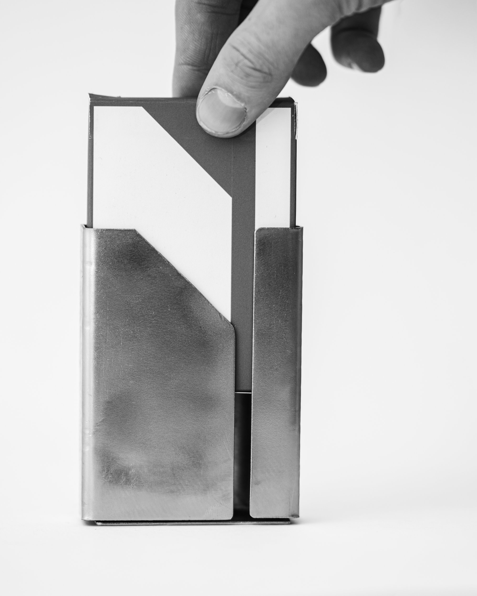 This metal card case is crafted from a single sheet of mild steel, folded and formed into a durable shell that protects your deck from wear. A hand-hammered side texture adds grip while giving the piece a raw, refined character. Inside, the cards sit in a custom-designed paper box that completes the presentation. A combination of industrial strength and bold graphics.